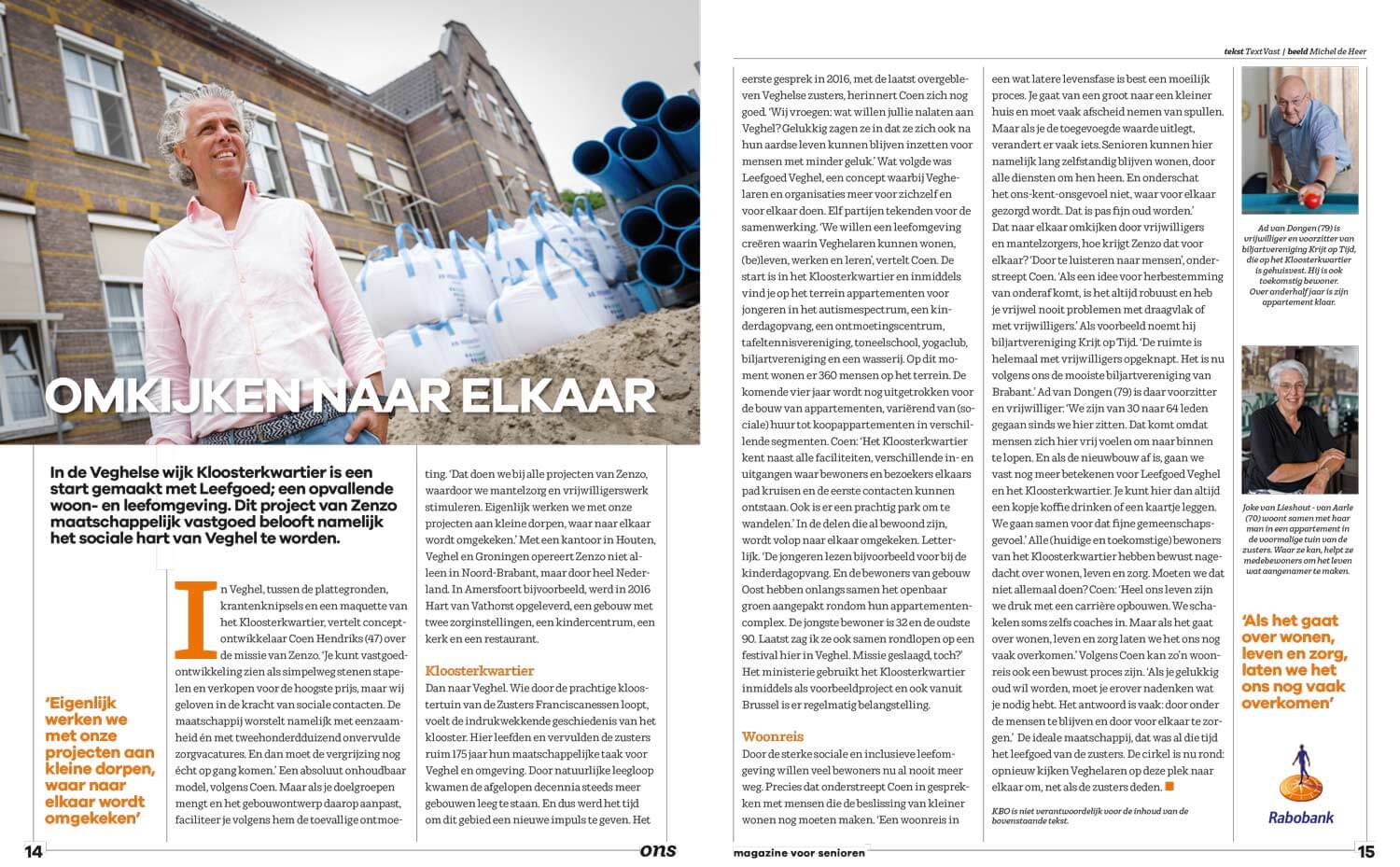 Als je gelukkig oud wil worden, moet je erover nadenken wat je nodig hebt. Het antwoord is vaak: door onder de mensen te blijven en door voor elkaar te zorgen. In Veghel ontstaat nu het Kloosterkwartier, een woon-en leefomgeving waar naar elkaar wordt omgekeken, conform de leefregels van de zusters die er 200 jaar hebben gewoond. Hoe dat is ontstaan en vanuit welk gedachtegoed, lees je in dit artikel van het KBO in samenwerking met de Rabobank