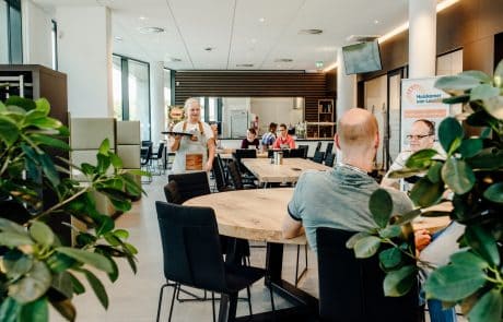 Een ander voorbeeld is het eetwerkcafé in het Huis van Leusden. Hier werken mensen met een verstandelijke beperking die wonen in de zorgwoningen op de eerste verdieping. In het eetwerkcafé verzorgen ze de lunch voor de medewerkers en bezoekers van het gemeentehuis. En ze ontmoeten tegelijk de bezoekers van het gemeentehuis die het café bezoeken. Dat zijn de buurtbewoners en de mensen die werken bij de maatschappelijke organisaties die zijn gehuisvest op de begane grond van dit gebouw.